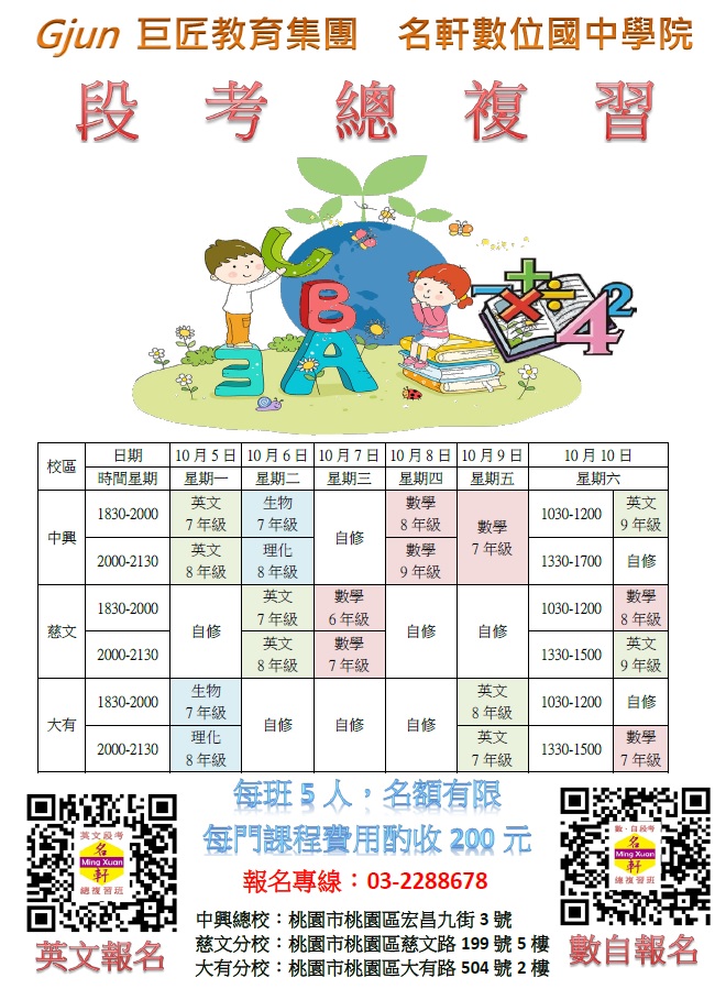 名軒數位國中學院--特地為了廣大的國中同學們~~可以考個段考好成績~~~特地開設段考複習班~~~讓有心想衝刺的同學~~可以多一個學習管道~~請踴躍報名喔~~