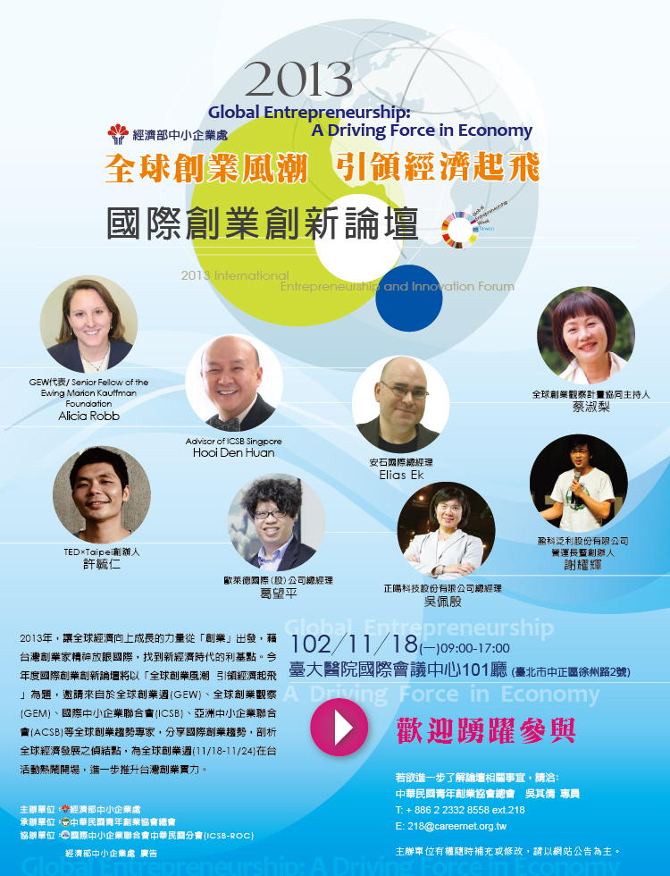 IMF 總裁拉加德(Christine Madeleine Odette Lagarde) 樂觀表示,2013 年亞洲仍是全球成長的引擎,最好的方法便是創造一個鼓勵創業精神的有利環境,亞洲國家才能創新成長。同時,這樣的思維與經濟部中小企業處之創業措施不謀而合,為奠定新創企業穩健經營基礎,型塑創業型社會,提供企業各階段之適切輔導,種子期(建基盤)提供創業諮詢服務,創建期(助成長)提供創業培訓課程及資金協助,成長期(選菁英)進行新創企業輔導及舉辦新創事業獎選拔,以此積極政策突破亞洲經濟僵局。